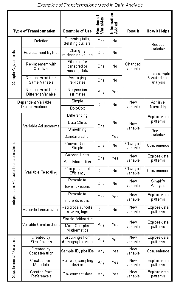 • Independent Variable Transformations—methods for creating new variables from the original independent variables, which have better correlations with the dependent variable.