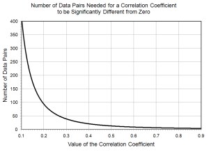 Tests—Every calculated correlation coefficient is an estimate. The “real” value may be somewhat more or somewhat less. You can conduct a statistical test to determine if the correlation you calculated is different from zero. If it’s not, there is no evidence of a relationship between your variables. This test looks at the absolute value of the correlation coefficient and the number of data pairs used to calculate it. The larger the value of the correlation and the greater the number of data pairs, the more likely the correlation will be significantly different from zero. For example, a correlation of 0.5 would be significantly greater than zero based on about 11 data pairs but a correlation of 0.1 wouldn’t be significantly different from zero with 380 data pairs. That’s why all statistical software outputs the number of data pairs and the test probability with a correlation. With some software, you can also calculate a confidence interval around your estimate to see if the interval includes the value you set as a goal. But one way or the other, you have to consider the variability of your calculated estimate to decide if the correlation is good.
