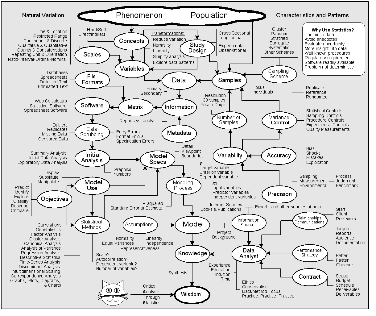 Data analysis begins when you want to investigate some phenomenon that occurs in a definable population. You collect samples of the population using an appropriate sampling scheme and other measures to control variance and avoid biases so that you will meet your targets for precision and accuracy. You may need to collect more (or less) than thirty samples to meet the resolution you need for the analysis. You measure variables relevant to the phenomenon on appropriate scales. These measurements are the data, which along with the metadata, form the information you structure in a file format your software can recognize as a matrix. Your objectives and aims for model use, together with the scales and natures of your variables, enable you to select appropriate statistical methods. You scrub the information and do an initial analysis, which together with the objectives and methods, lead to your model specifications. Using the specs, you go through the steps of the modeling process to develop and calibrate a model, and evaluate possible violations of assumptions. From the model, you build on your knowledge of the phenomenon. Eventually, from critical analysis through statistics, you can synthesize the wisdom you need to make informed decisions.