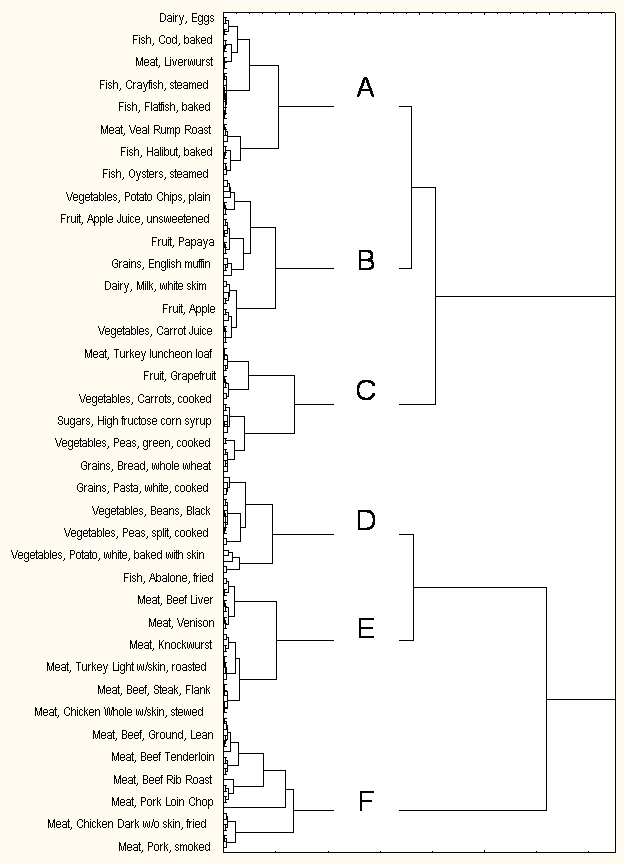 Data for this analysis consisted of values of five variables (i.e., calories, carbohydrates, proteins, fats, and Glycemic index) for 213 sample foods. The figure shows the tree diagram produced by the cluster analysis (although only 38 of the 213 foods are listed to aid readability). From the tree diagram, an appropriate number of clusters are selected. Cluster selection requires a combination of information on the statistical differences between potential clusters, an understanding of the data to interpret why each member might belong to a certain cluster, and a sense of how many clusters might be reasonable for characterizing the data. The letters in the tree diagram of the figure show one of the many possible sets of clusters.